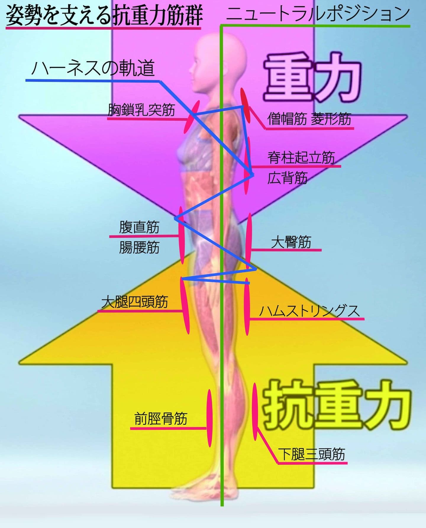 地球上に住む私達の身体には絶えず重力が作用しており、その重力から姿勢を保持しているときに働いている主要な筋肉群を抗重力筋群と言います。抗重力筋の働きは姿勢が重心線からズレるのを直ちに補正(姿勢反射反応)することで姿勢バランスを維持することです(代償的姿勢戦略)そして、無意識下で常に働いている筋肉なのでとても疲れやすいのです。