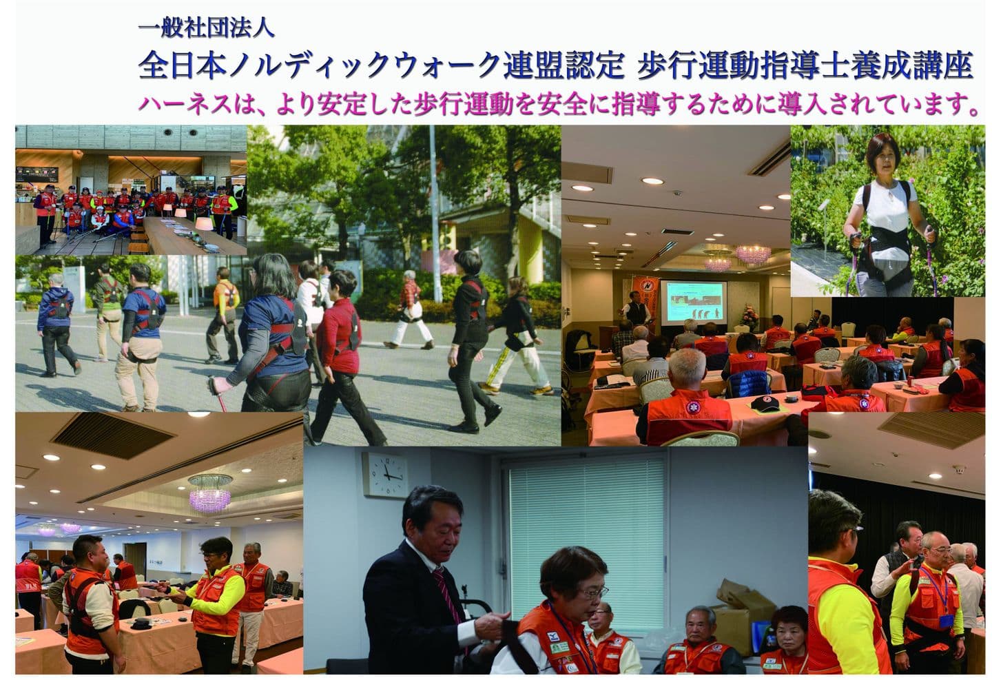 ハーネスの特徴でもある体幹・体軸安定機能は歩行時の重心移動をスムーズに導くので歩行安全性が高まります。このことが評価され全日本ノルディックウォーク連盟の主催する歩行運動士養成講座においてカリキュラムのひとつとして採用されています。