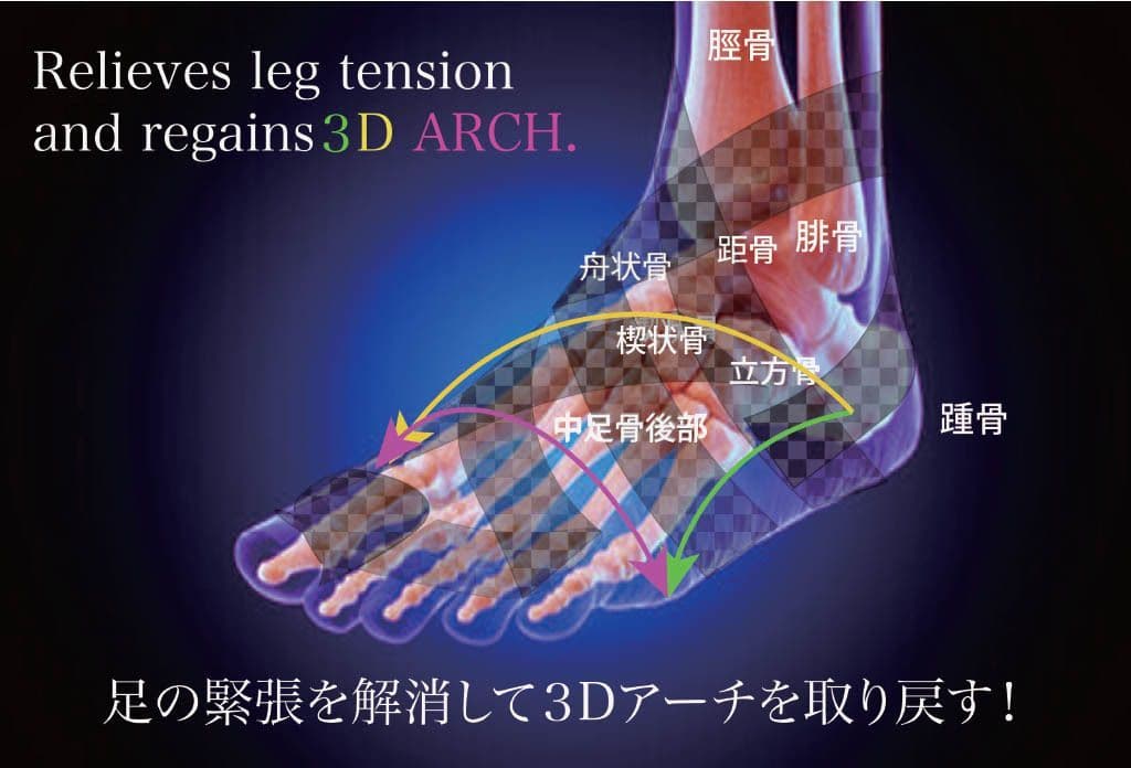 母指・小趾など足指の反射感度を高め足指や甲(中足骨)周りの過緊張を緩め、腱や筋活動の柔軟性を取り戻すことで縦・横アーチの可動性を高め、運動性能を活発 にして、つま先のグリップ力や足首のバランス力を強化して足の骨格の縦・横アーチの形成を促し衝撃吸収力を高めます